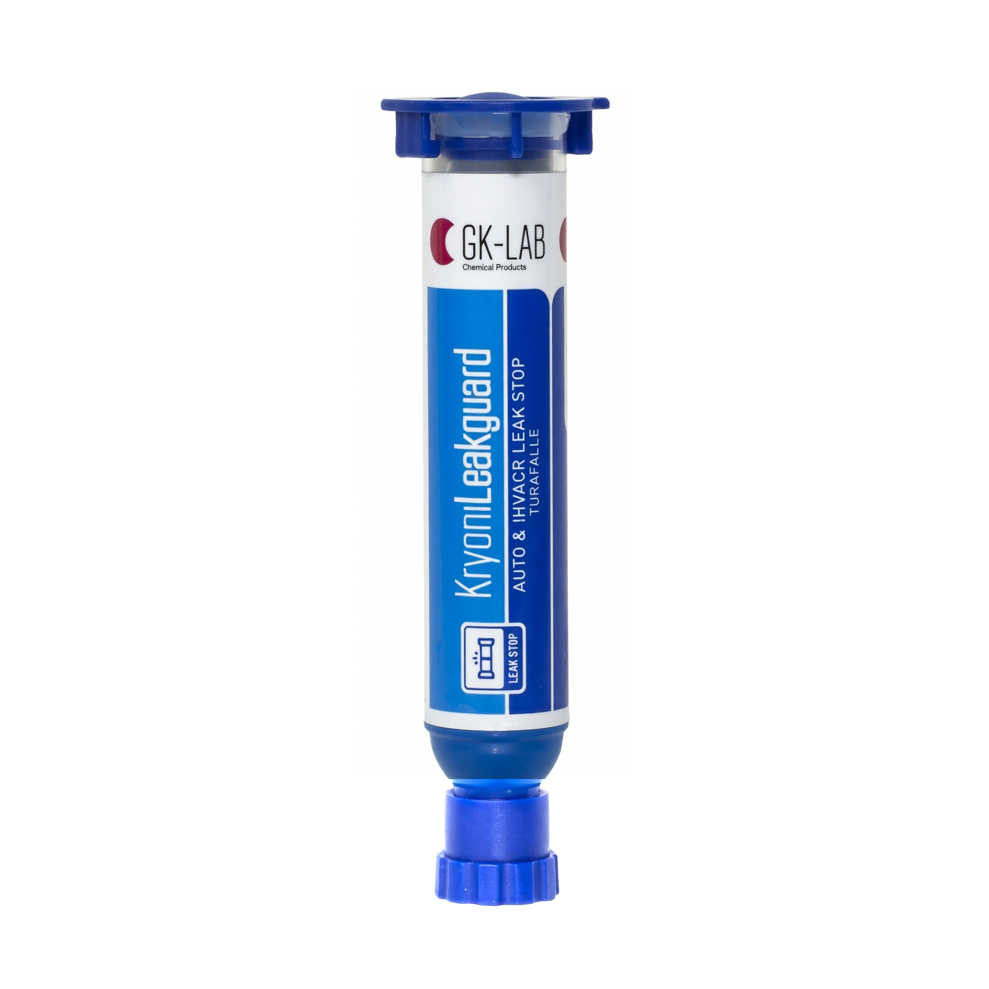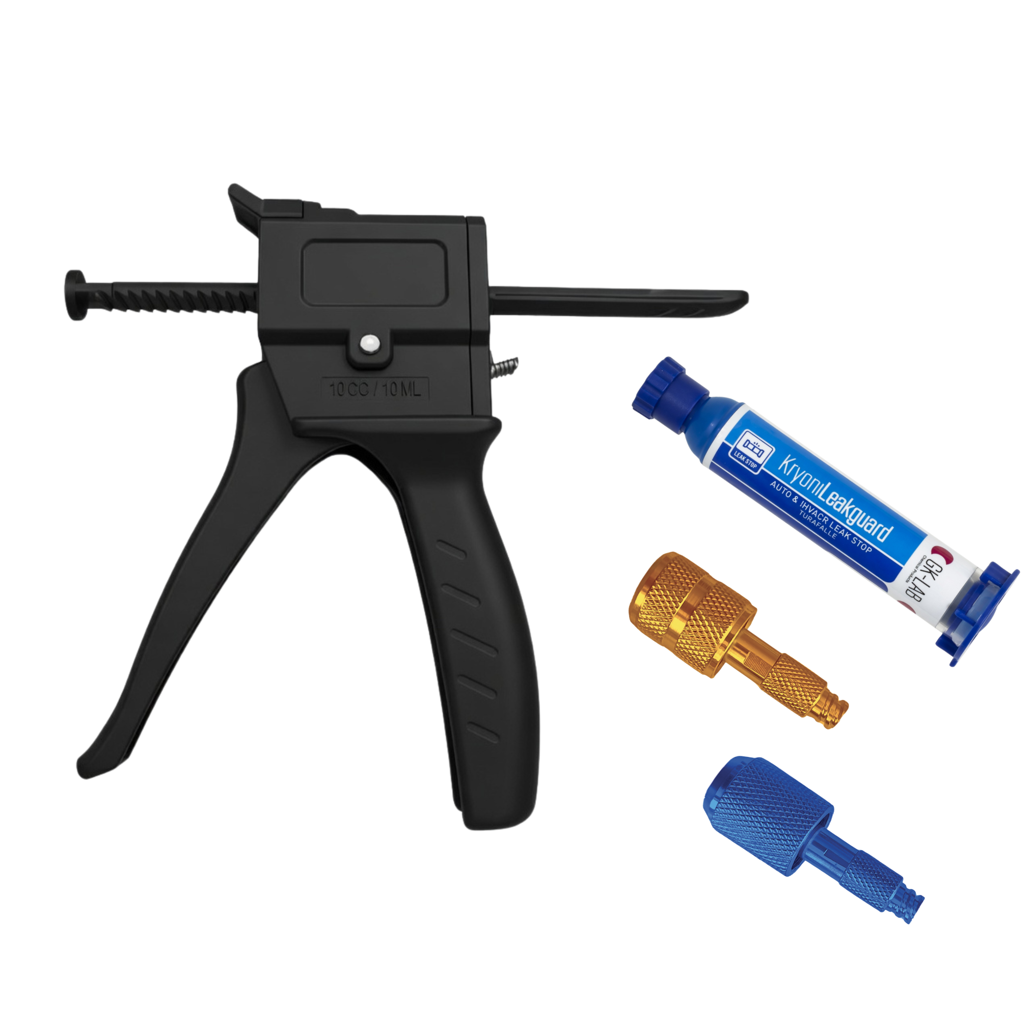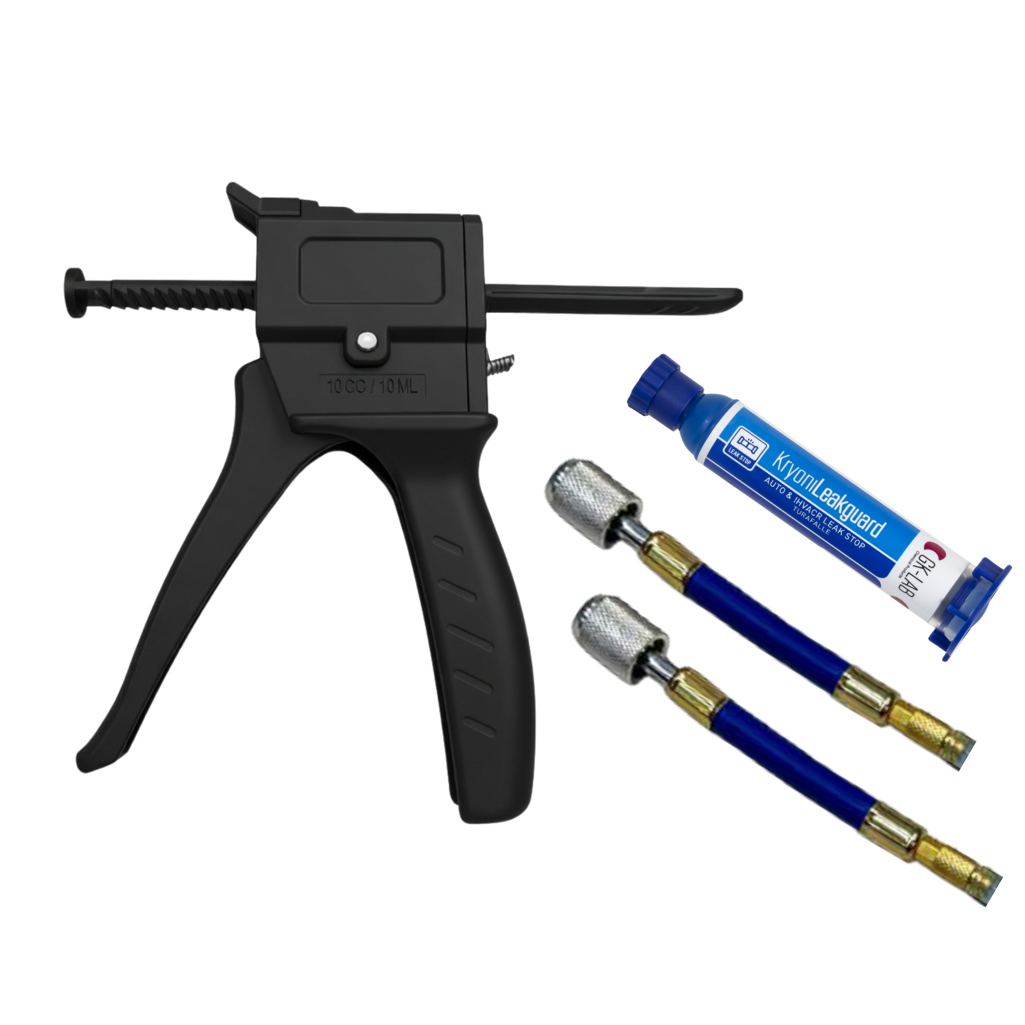 Comprende n° 1 pistola GK-Gun SMART piccola per utilizzo con cartucce da 8 ml., n° 2 raccordi flessibili per collegamento a sistemi con attacco 1/4 e 5/16, n° 1 cartuccia 8 ml. di turafalle KryonLeakGuard, in valigetta di plastica.