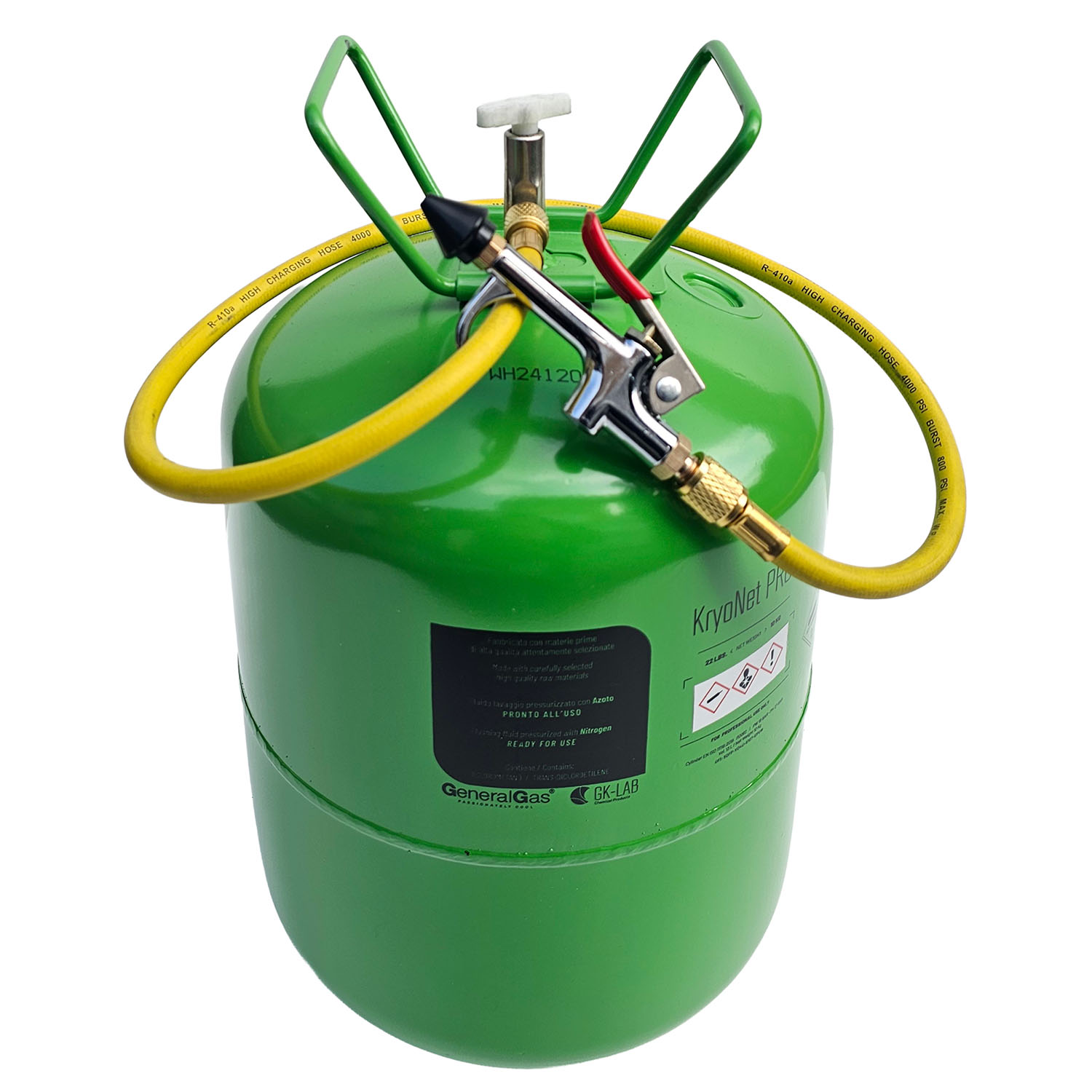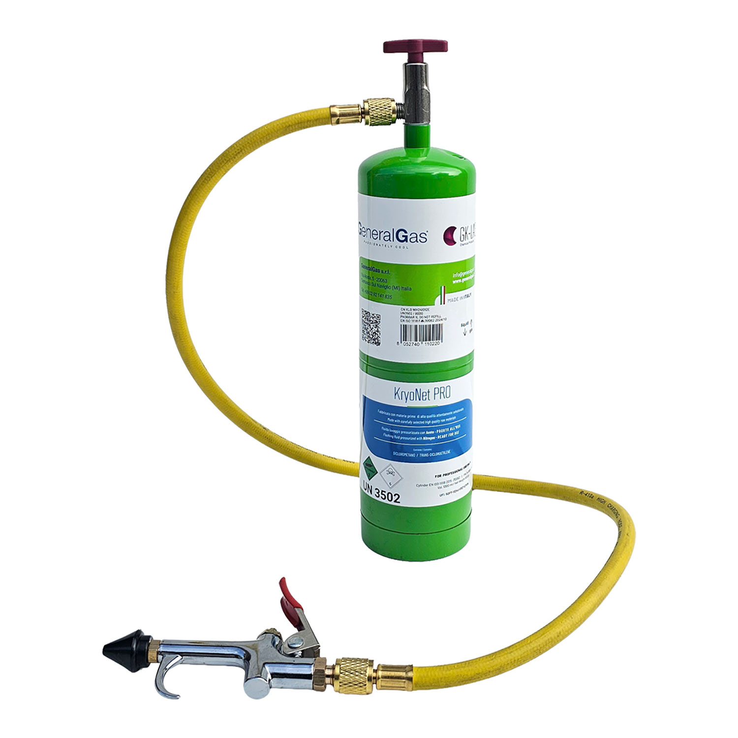 Pistola e tubazione con attacco da ¼" femmina, per utilizzo con solvente KryoNet PRO in contenitori pressurizzati monouso da 13 litri (10 kg di solvente) e 1 litro (800 grammi di solvente)