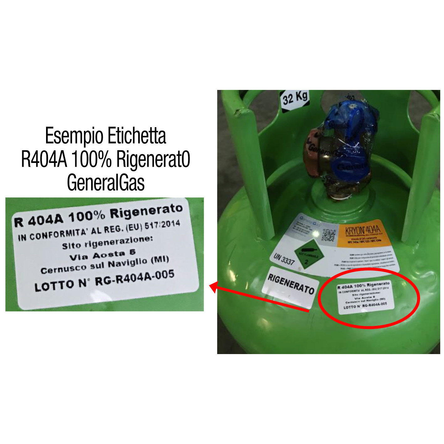 Informiamo i nostri clienti che un prodotto rigenerato, per essere definito tale e quindi utilizzabile liberamente (es. fino al 2030 per l'R404A rigenerato), deve riportare sull'etichetta apposta sulla bombola le seguenti diciture: