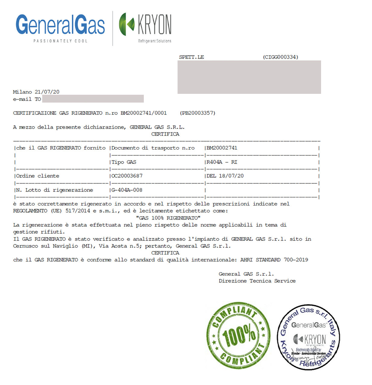 Rigenerazione effettuata in accordo al Regolamento Europeo F-Gas n° 517/2014 con riporto delle caratteristiche del gas R404A a quelle richieste dallo standard AHRI700-2017 (caratteristiche equivalenti a quelle del prodotto vergine).