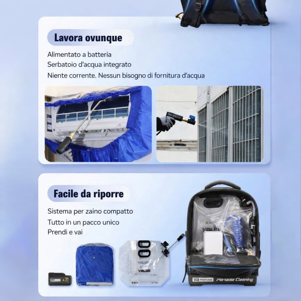 VALUE Idropulitrice Portatile a Batteria per Sistemi HVACR VCB-1Li - due Livelli di Pressione (4,5 e 6,5 bar) - Portata 1,8 litri/minuto
